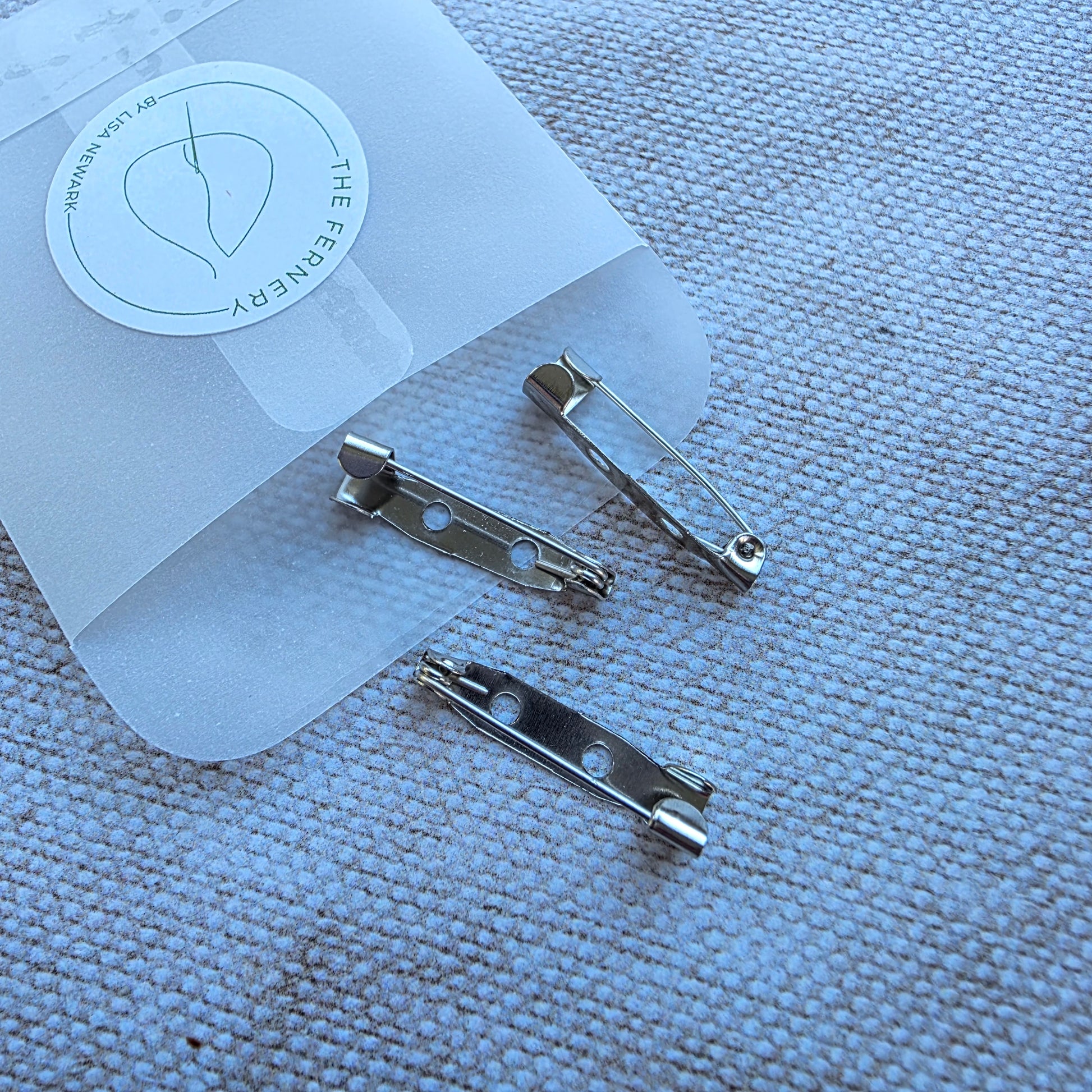 These are the brooch backs I personally use in my studio. They can be glued or stitched in place. I prefer the pins that just hook in, rather than having to fiddle with a clasp, so these are the ones I sell.