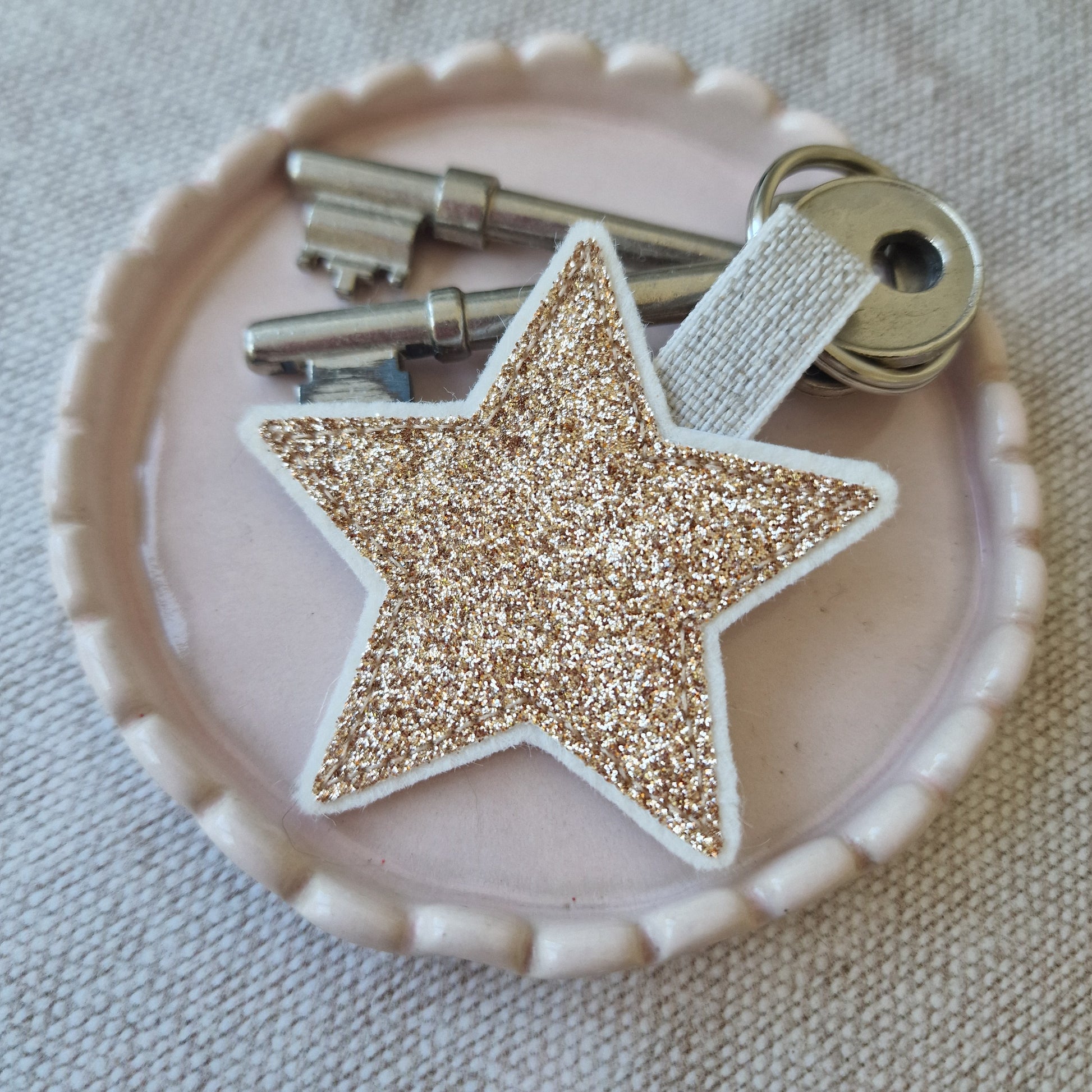 These gorgeous little stitched sparkly stars are just perfect to keep on your keys. The glitter is backed with two layers of thick, reinforced wool felt, and finished with a Linen loop and a silver coloured split ring.
