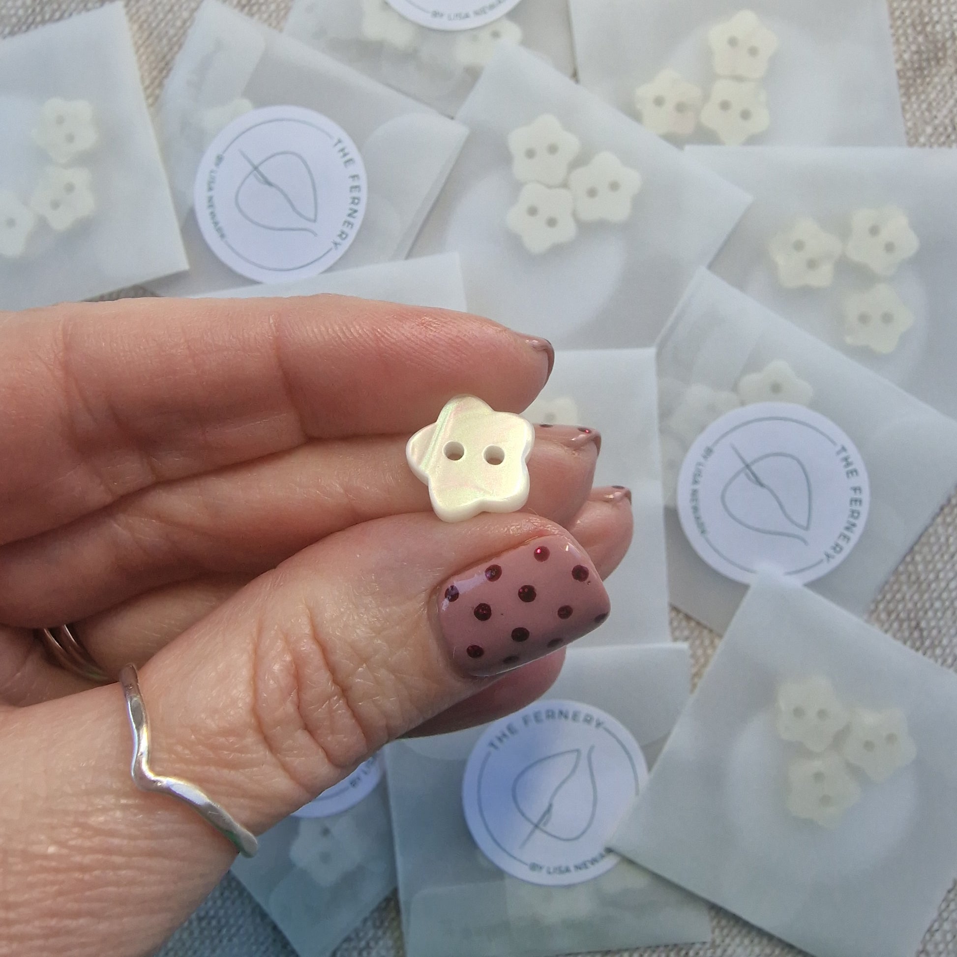 Super special glossy resin pearl-effect flower shaped buttons. The back of each button is a solid cream colour.